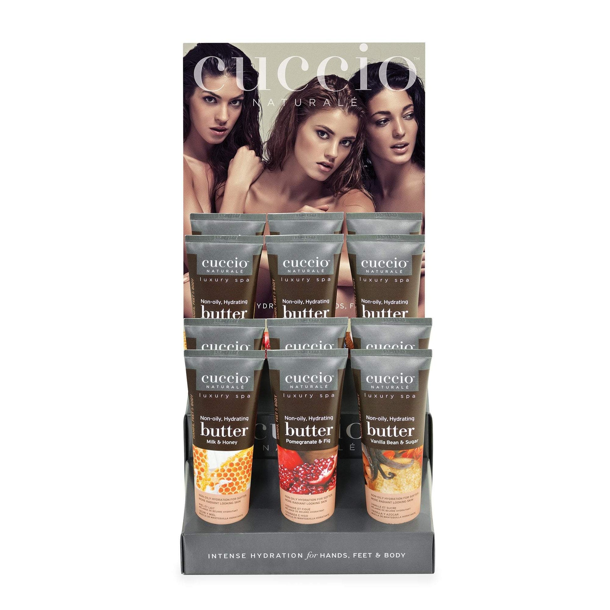 Draw attention to your Cuccio™ Naturale Butter Blends and make more sales with this attractive retail display. Butter Blends rich non-oily 24 hour hydration with time released emollients for softer more radiant skin. Contains 4 of each of the following 4 oz. Butter Blends: Milk & Honey, Pomegranate & Fig, and Vanilla Bean & Sugar. 7.25” W x 13” H x 9.5” DIngredients