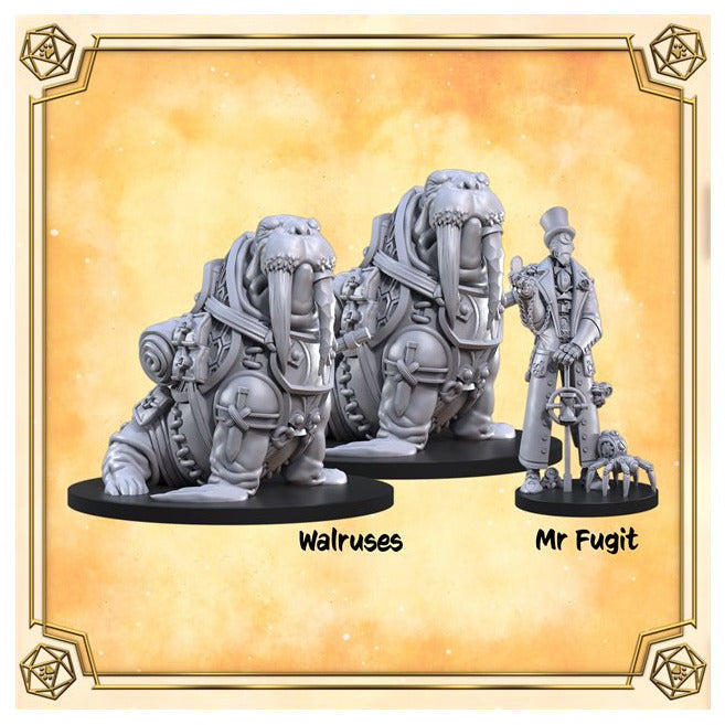 Meet the mysterious Mr. Fugit in your next roleplaying game! Flanked by his imposing Walrus bodyguards, Mr. Fugit is a man with a lot of time on his hands — literally. Find out what secrets he and his henchmen are hiding with the Time in a Bottle set.